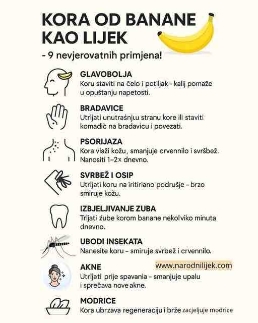 Kora od banane za psorijazu – Piling od banane vlaži kožu, ublažava svrbež i liječi psorijazu. Nanesite piling na zahvaćena područja 1-2 puta dnevno, a efekti će biti vidljivi za nekoliko dana.