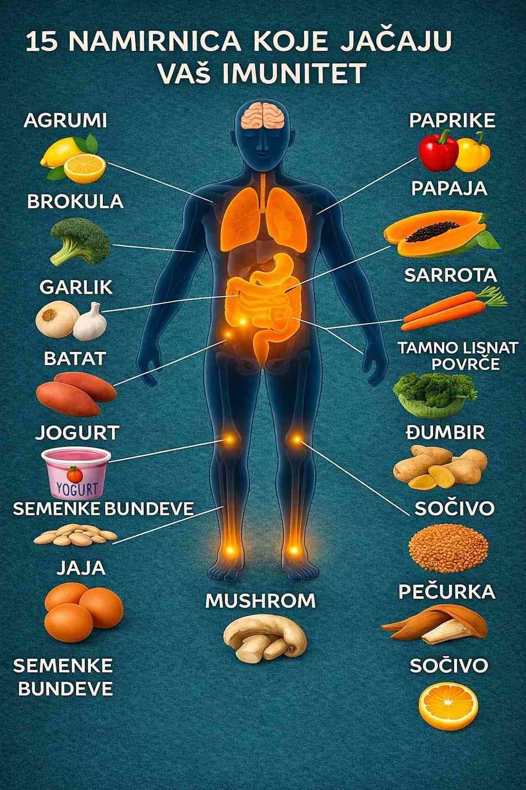 Imunitet je prirodni odbrambeni sistem našeg tijela. Njegova snaga zavisi od mnogo faktora: ishrane, sna, stresa, fizičke aktivnosti i općeg načina života. Iako nijedna namirnica ne može „čudotvorno“ spriječiti bolesti, pravilna i raznovrsna ishrana može značajno doprinijeti normalnom funkcionisanju imunog sistema.