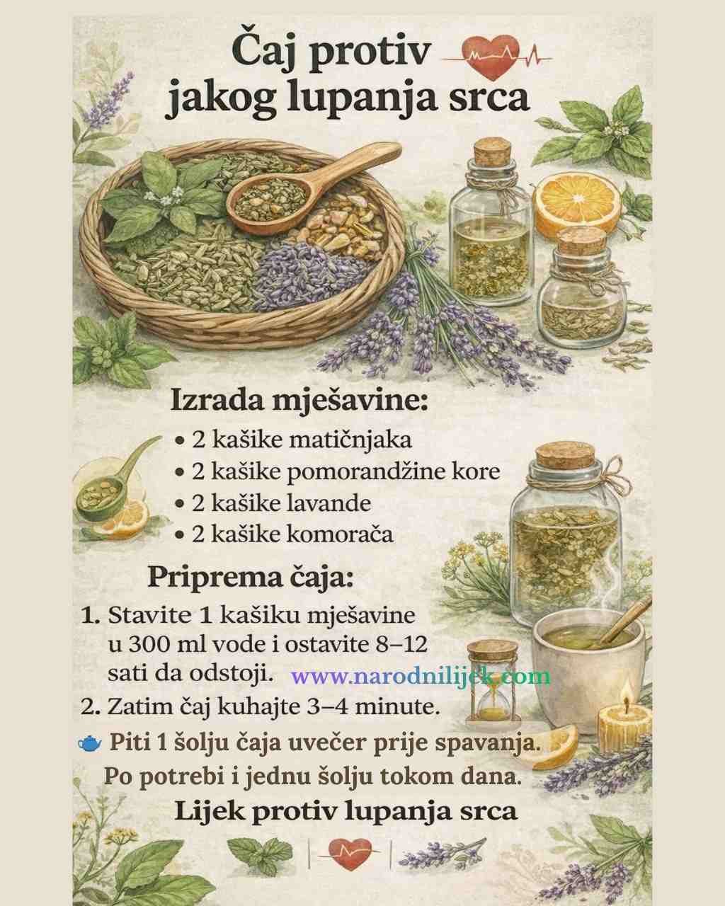 Napravite mješavinu od 2 kašike matičnjaka, pomorandžine kore, lavande i komorača. Kašika te mješavine se stavi u 300 ml vode i ostavite 8-12 sati da odstoji, a onda kuhajte 3-4 minuta. Pijte jednu kašiku dnevno i uvečer prije spavanja.