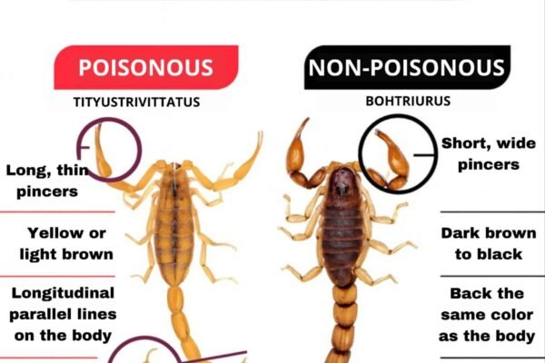🔴 Otrovni (Tityus trivittatus): Duga, tanka kliješta. Žuta ili svijetlosmeđa. Paralelne linije na tijelu. Dvostruki žalac na repu. ⚫ Neotrovni (Bothriurus): Kratka, široka kliješta. Tamnosmeđa do crna. Leđa iste boje kao i tijelo. Jedan žalac na repu. 💡 Savjet: Održavajte svoj dom čistim i provjeravajte tamne kutove kako biste izbjegli susrete sa škorpionima.