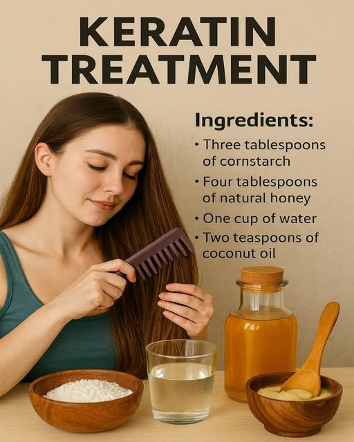 Ovaj domaći tretman nije hemijski “keratin”. To je privremena kozmetička maska za zaglađivanje koja hidrira, smanjuje kovrčanje i ostavlja kosu mekšom i sjajnijom zahvaljujući kombinaciji humektanata (med), hranjivih lipida (kokosovo ulje) i omekšavajućih škrobova (kukuruzni škrob).
