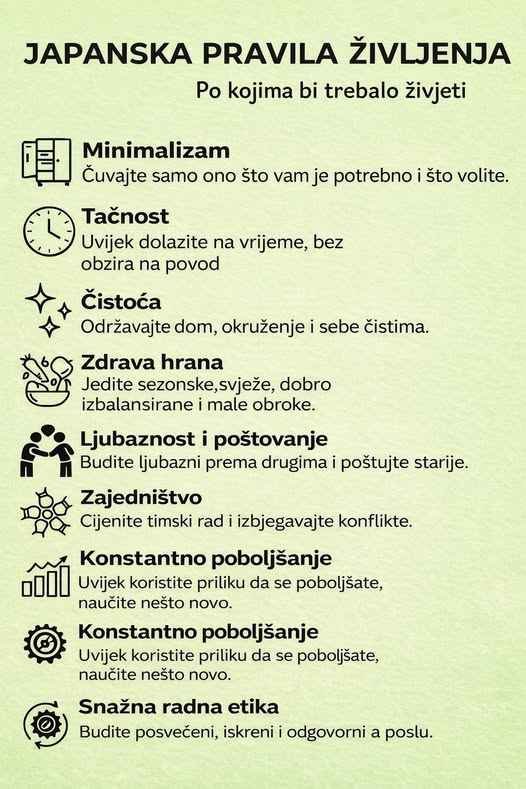 Japan je odavno poznat po svojoj dugovječnosti, disciplini i kvaliteti života. Njihova kultura obiluje praktičnim i jednostavnim pravilima koja pomažu ljudima da žive smirenije, organizovanije i sretnije. Slika prikazuje osam ključnih japanskih principa koji mogu svakome donijeti više ravnoteže u svakodnevni život.