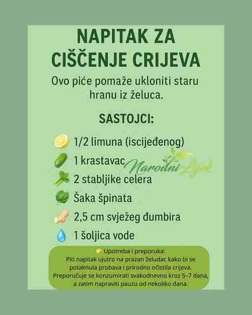 Nemojte praviti zalihe za više dana. Najbolje je svako jutro svježa porcija. Obavezno pijte najmanje dvije litre vode dnevno dok traje kura. Čišćenje crijeva na ovaj način možete provesti jednom godišnje. Također, ova kura će vam pomoći ukoliko imate gastritis, kolitis, čir na želucu i dvanaestercu, bolesti urinarnog trakta, cistitis, pijelonefritis, prekomjernu težinu te narušen metabolizam.
