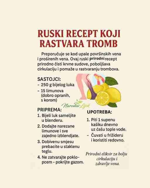 Preporučuje se svima koji imaju probleme sa zapaljenjem površinskih vena i koji pate od proširenih vena. Sve što vam je potrebno da biste napravili ovaj ljekoviti recetp koji rastvara tromb jeste 250 g bijelog luka i 15 limunova. U blenderu sameljite bijeli luk. Dodajte dobro oprane limunove (sa korom) i sve zajedno izblendajte.