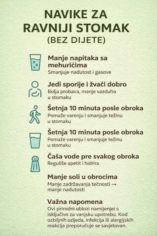 Umjesto da se odmah sjedite ili legnete nakon obroka, prošetajte lagano 10 minuta. Ovo aktivira probavu i smanjuje osjećaj “težine” u stomaku. U Bosni imate mnogo prekrasnih parkova i šetnica – iskoristite ih!