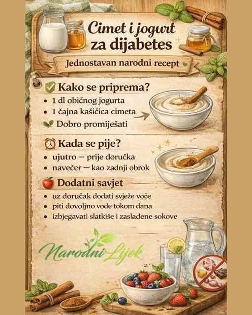 U šoljicu od 1 dl jogurta potrebno je umiješati 1 čajnu žličicu cimeta. Taj se pripravak pije svakog jutra prije doručka te navečer kao zadnji obrok.