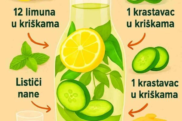 Temeljito operite sve proizvode. Limun i krastavac narežite na tanke kolutove. Sve stavite u veliki vrh ili teglu. Prelijte hladnom i dobro promiješajte. Ostavite da odstoji u frižideru najmanje 2 sata – ili preko noći za najbolji ukus. Procijedite ili pijuckajte. Dolijevajte vodu po potrebi!Kako piti vodu za ravan stomak za najbolje rezultate Pijenje vode…