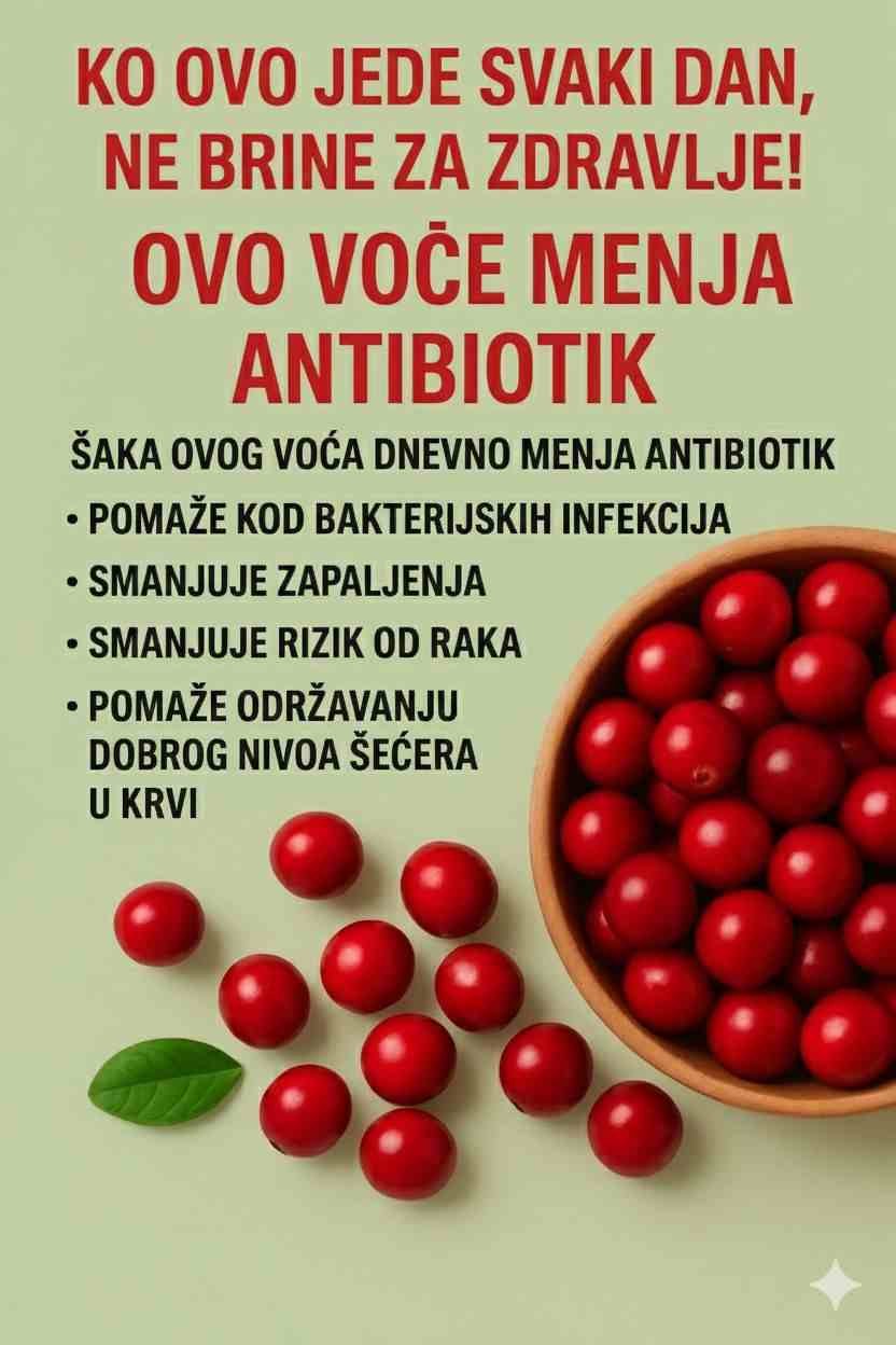 Ovo voće je posebno poznato po visokom sadržaju proantocijanidina (PACs). Ove materije sprječavaju da se bakterije (posebno E. coli, čest uzročnik urinarnih infekcija) vežu za zidove urinarnog trakta. Konzumiranjem šake ovog voća dnevno, znatno se smanjuje rizik od razvoja bakterijskih infekcija, posebno uroloških, čineći ga snažnom prirodnom preventivom koja može smanjiti potrebu za standardnim antibioticima.