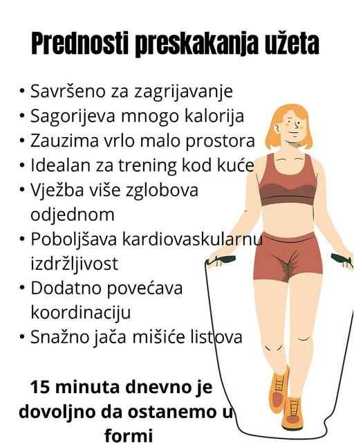 Samo 10 do 15 minuta preskakanja užeta može sagorjeti više kalorija nego mnoge druge kardio vježbe. To pomaže u održavanju zdrave tjelesne težine i smanjenju viška masnoće.