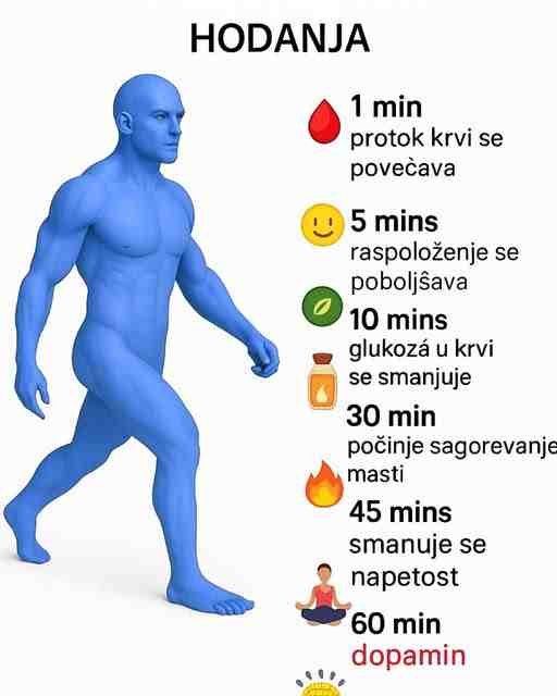 Poslije 5 minuta → Počinje se poboljšavati raspoloženje, a stres i napetost polako nestaju. Hodanje potiče oslobađanje endorfina – hormona sreće.