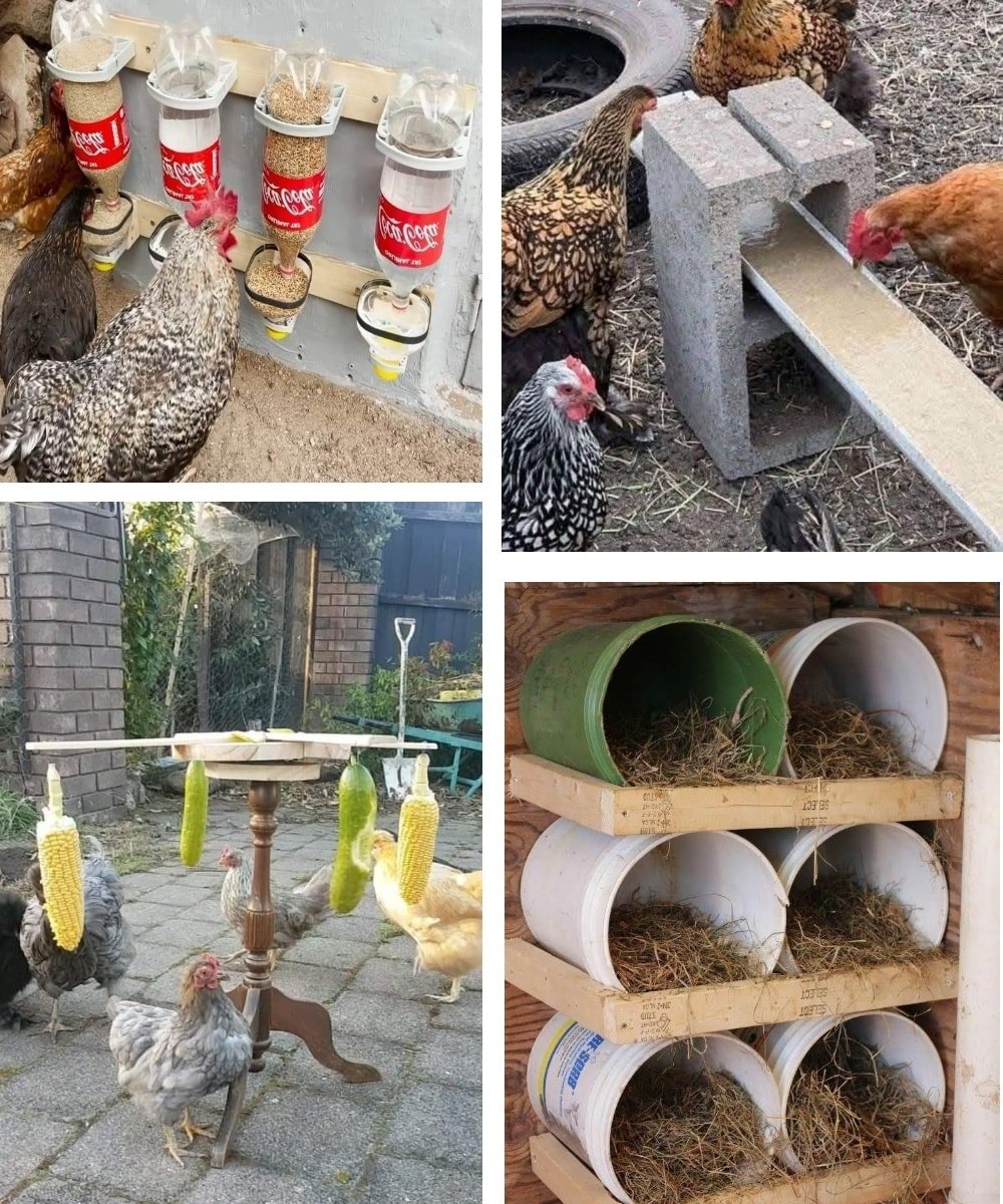 Reciklirane posude mogu se lako pretvoriti u zidne hranilice, što štedi prostor i održava hranu čistom. Također, jedan obični betonski blok može poslužiti kao čvrsta posuda za zrno, otporna na prevrtanje i lako dostupna svakoj koki.