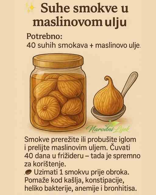 Priprema: Potrebno je suhe smokve prerezati na pola ili izbušiti iglom radi boljeg upijanja maslinovog ulja. Stavite smokve u teglu i prelite ih maslinovim uljem.Zatvorite poklopcem i ostavite u frižideru. Nakon 40 dana, možete konzumirati ovaj prirodni lijek.