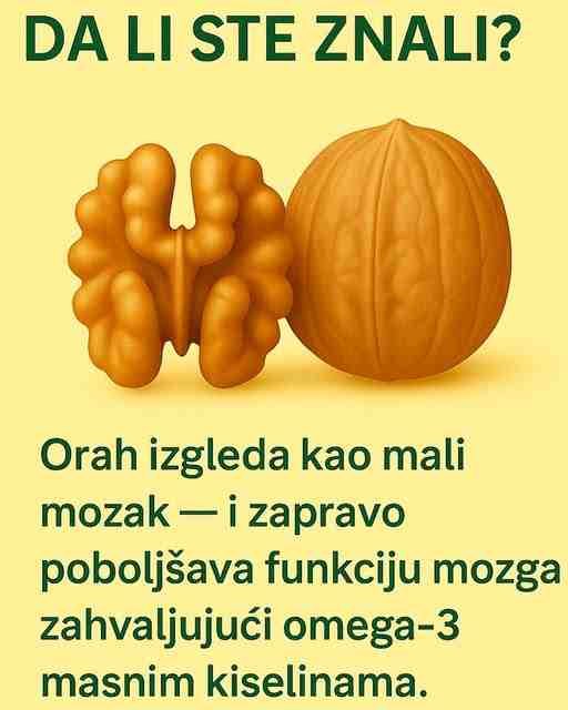 To nije slučajnost — orah zaista poboljšava funkciju mozga! Njegov oblik podsjeća na mozak jer sadrži upravo one hranjive tvari koje naš mozak najviše voli. Zahvaljujući visokom sadržaju omega-3 masnih kiselina, antioksidansa i vitamina E, orasi podržavaju pamćenje, koncentraciju i mentalnu jasnoću.