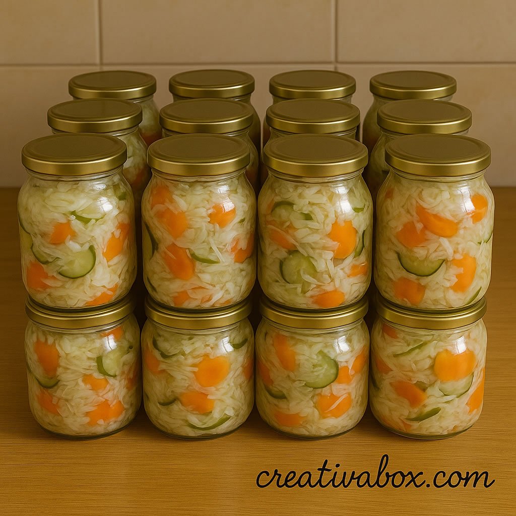 Ako želite da vaša zimnica bude bogata bojama, ukusima i mirisima, onda je šarena salata u tegli pravi izbor! Ova kombinacija kupusa, paprika, krastavaca i šargarepe daje savršen balans svježine i hrskavosti. Uz dodatak sirćeta, šećera i vinobrana, dobićete trajnu i ukusnu salatu koja će obogatiti svaki zimski obrok.