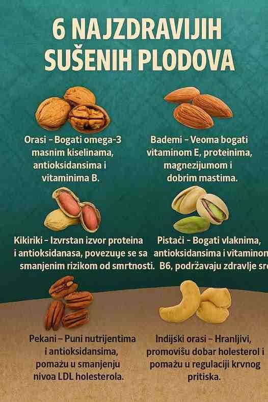 Tehnički, one su sjeme. Poznate su po visokom sadržaju proteina, vlakana, kalija, antioksidansa i masti korisnih za srce. Pružaju više vitamina B6 od bilo kojeg drugog orašastog voća.