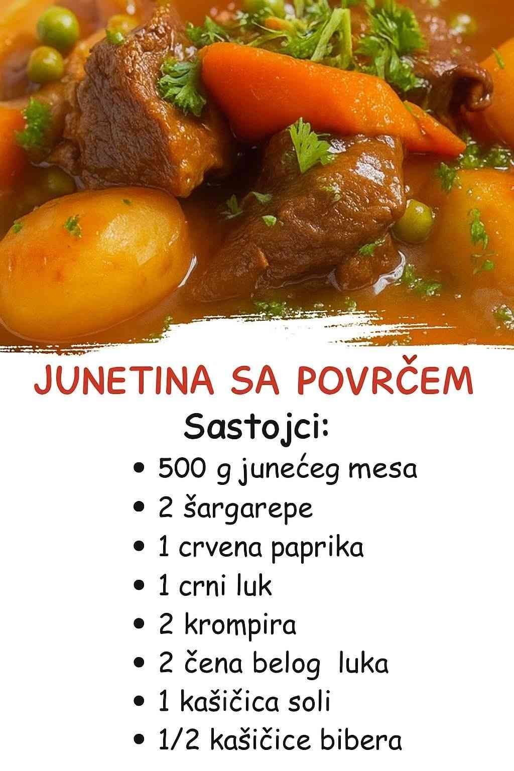 Junetina s povrćem je klasično jelo koje se često priprema u Bosni i Hercegovini i široj regiji. Karakteristično je po mekanom mesu i obilju sočnog povrća, a može se pripremati na razne načine, od variva do pečenja. Ključ je u sporom kuhanju kako bi se meso opustilo i upilo sve arome.