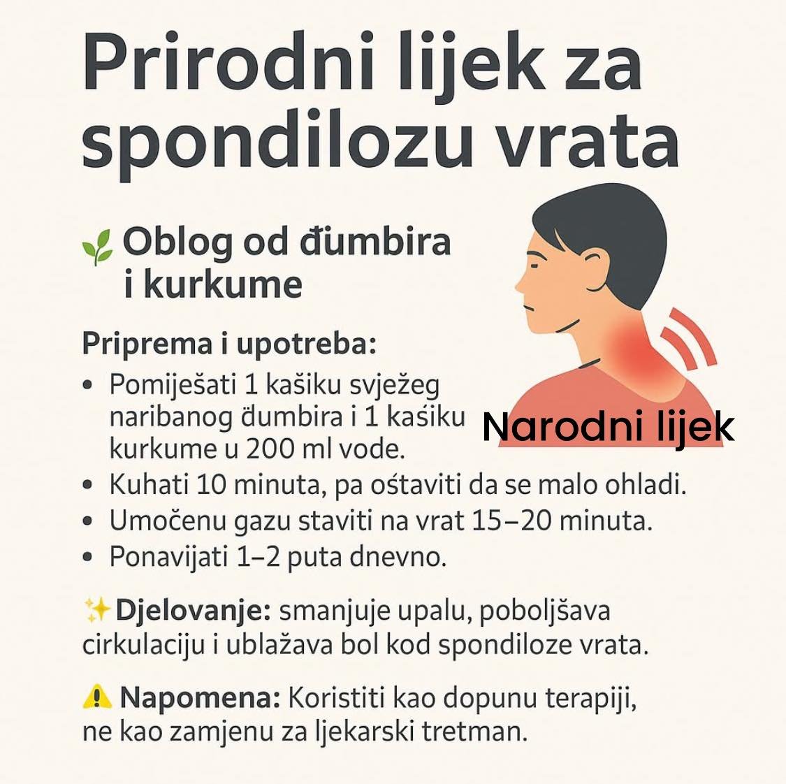 Pomiješajte 1 kašiku svježeg naribanog đumbira i 1 kašiku kurkume u prahu u 200 ml vode. Kuhajte oko 10 minuta, pa kada se tečnost prohladi do podnošljive temperature, umočite gazu i stavite oblog na vrat 15–20 minuta. Postupak ponavljajte 1–2 puta dnevno. Đumbir poboljšava cirkulaciju i smanjuje bol, dok kurkuma svojim snažnim antiupalnim djelovanjem ublažava upalu i ukočenost.