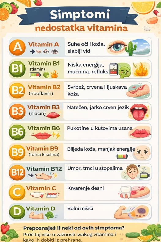 Vitamini su esencijalni nutrijenti koji igraju vitalnu ulogu u održavanju cjelokupnog zdravlja i pravilnog funkcioniranja ljudskog tijela. Oni podržavaju važne procese kao što su vid, zdravlje kože, snaga mišića, funkcija živaca, stvaranje krvi i imunološki sistem. Kada tijelo ne prima dovoljno vitamina putem prehrane ili sunčeve svjetlosti, to može dovesti do nedostatka vitamina. Ovi nedostaci često pokazuju vidljive znakove koje ne treba zanemariti.