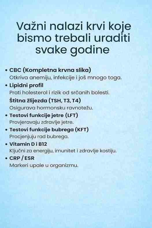 Godišnji krvni testovi su jednostavan, ali vrlo efikasan način brige o zdravlju. Omogućavaju rano otkrivanje problema i pomažu u očuvanju kvaliteta života. Prevencija je uvijek bolja od liječenja.