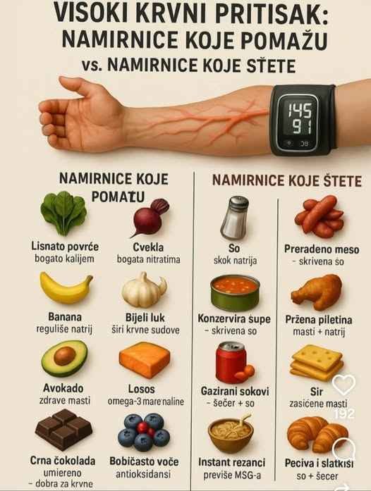 Visoki krvni pritisak (hipertenzija) jedan je od najčešćih zdravstvenih problema današnjice. Iako na njega utiču genetika, stres, fizička aktivnost i životne navike, prehrana igra izuzetno važnu ulogu. Slika jasno prikazuje razliku između namirnica koje mogu doprinijeti zdravijem krvnom pritisku i onih koje ga mogu pogoršati.